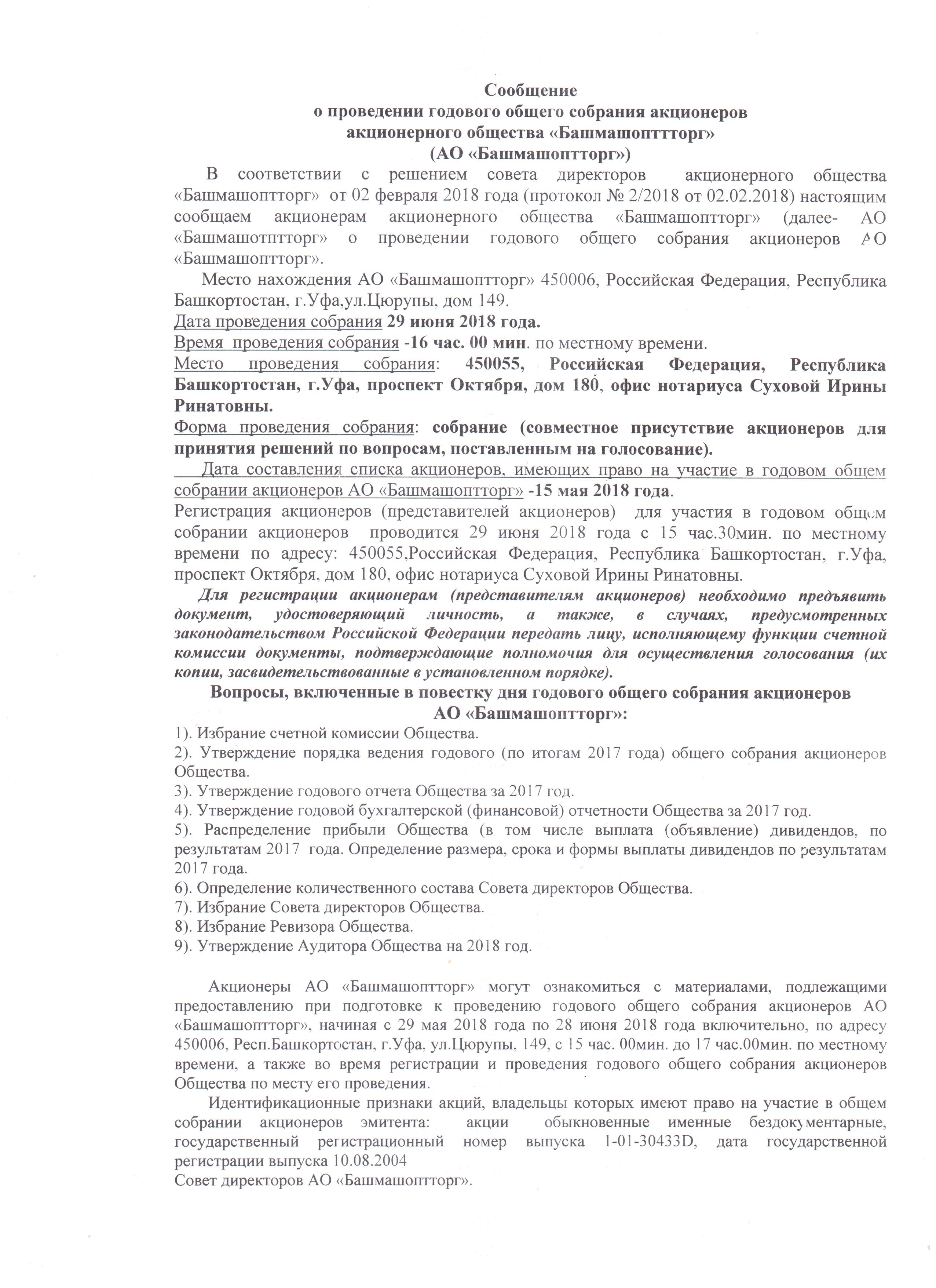 | 7 | Сообщение о проведении Общего собрания акционеров (предусмотрено Уставом Общества) от 04.06.2018 | 04.06.2018 | Загрузить (865,00 Кб) |  |
