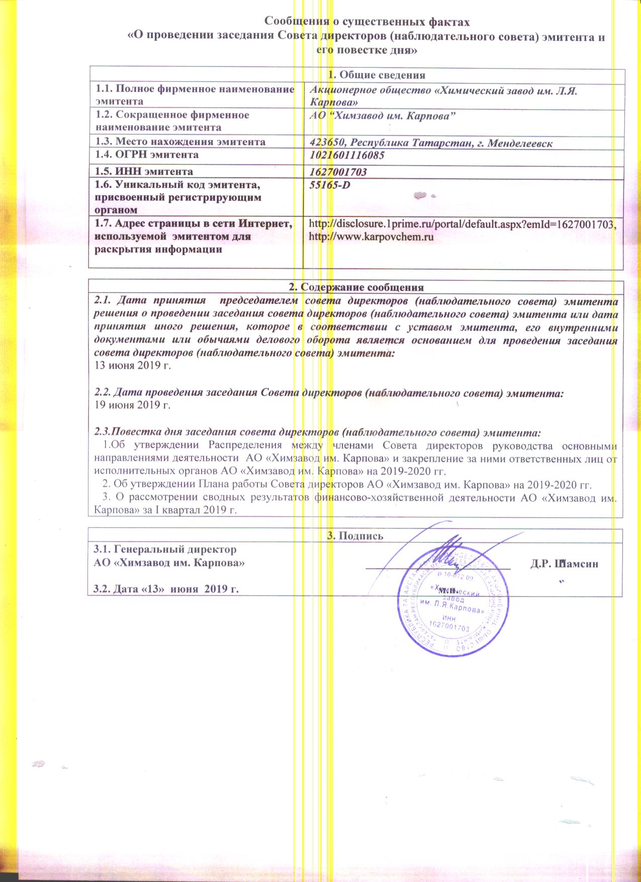 | Сообщение о существенном факте о проведении заседания Совета директоров (наблюдательного совета) и его повестка дня от 13.06.2019г (257,89 Кб) |  |