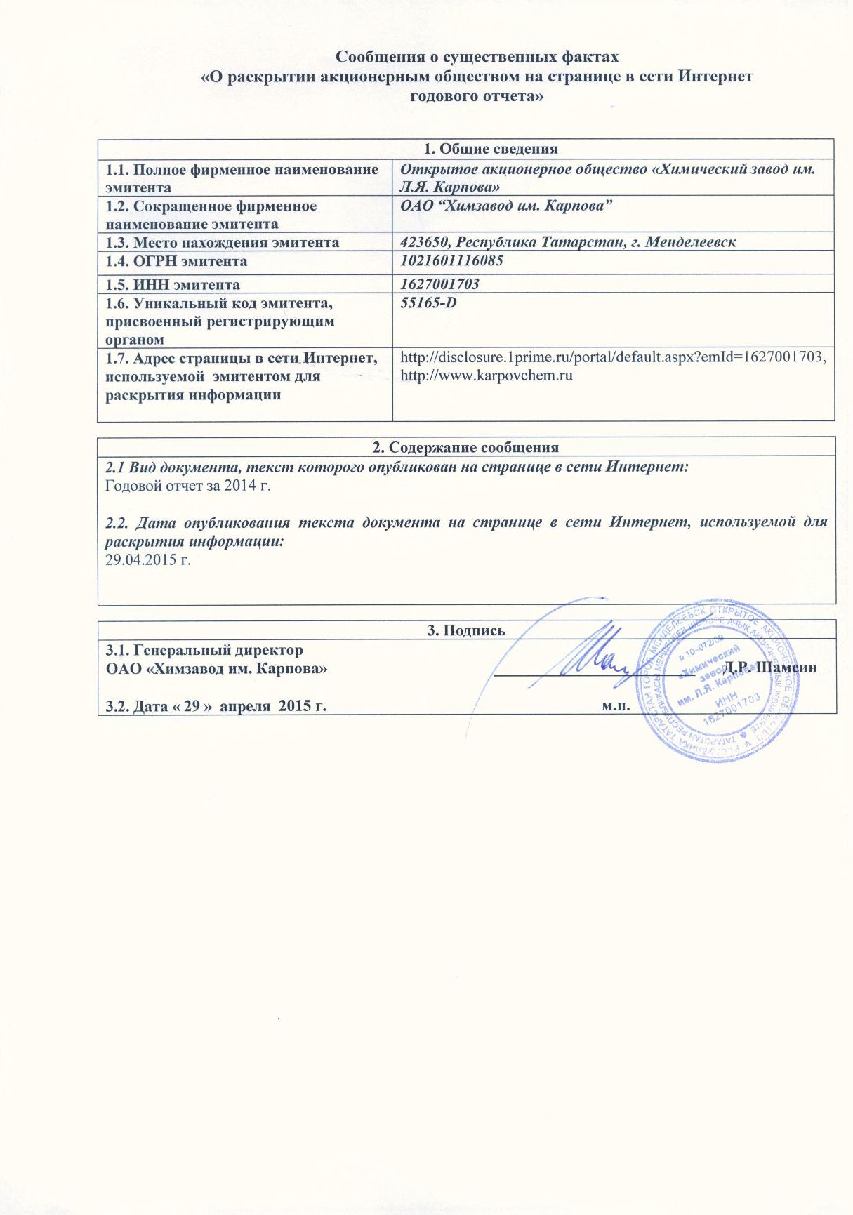 | Раскрытие акционерным обществом на странице в сети Интернет Годового отчета от 29.04.2015 (199,27 Кб) | |