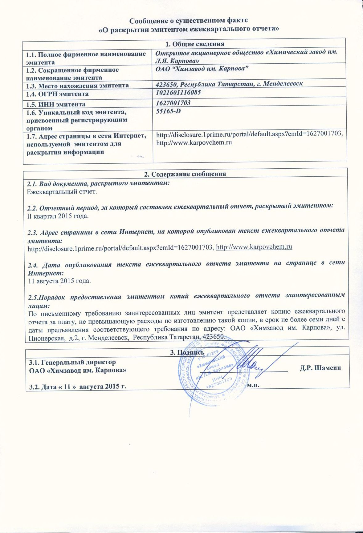 | Сообщение о существенном факте О раскрытии эмитентом ежеквартального отчета от 11.08.2015 (271,24 Кб) | |