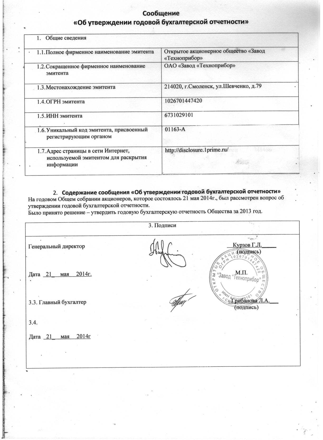 | 12 | Сообщение об утверждении или неутверждении годовой бухгалтерской отчетности (2) | 21.05.2014 | 22.05.2014 | Загрузить (204,95 Кб) | |