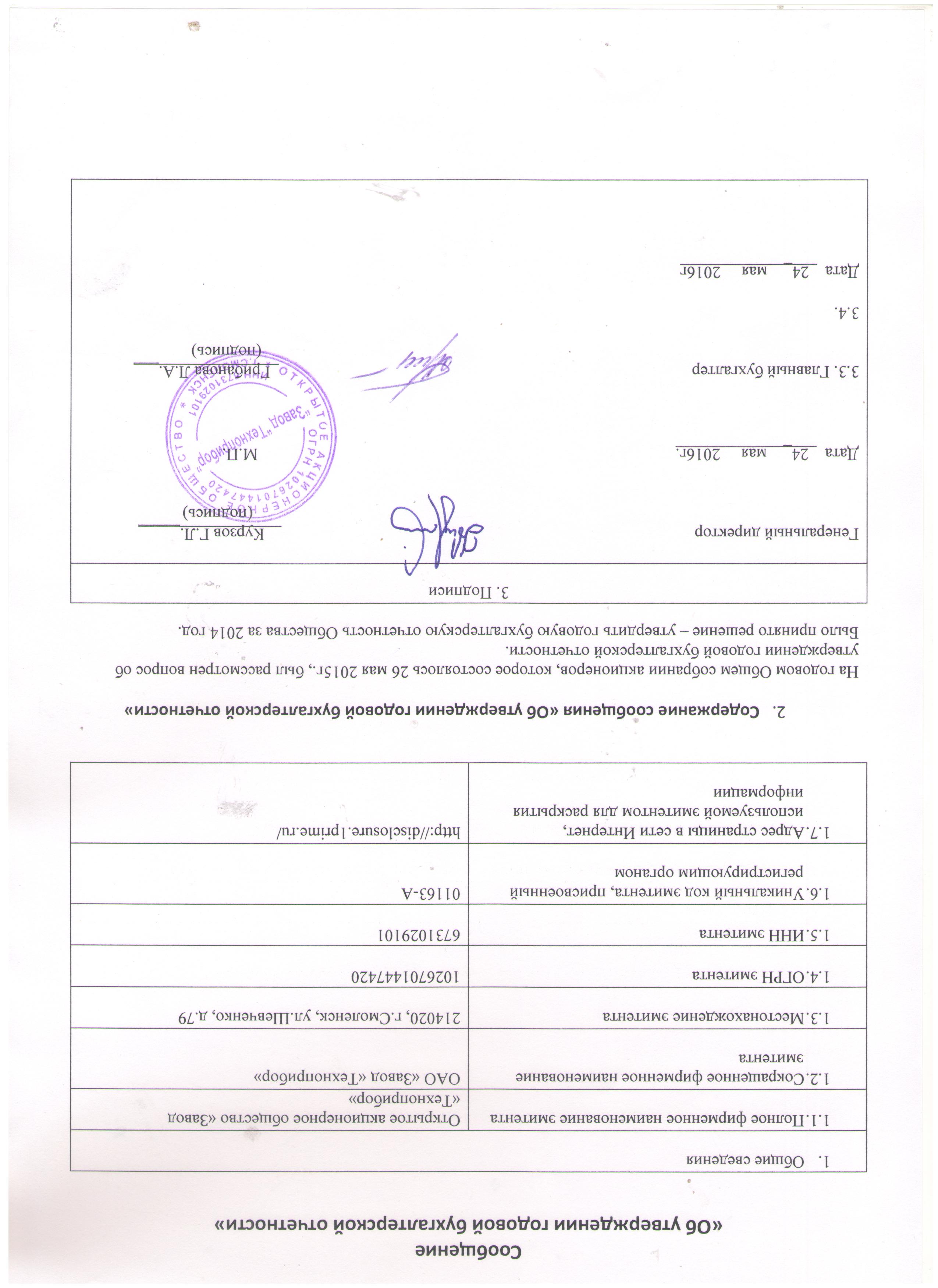 | 10 | Сообщение об утверждении или неутверждении годовой бухгалтерской отчетности (4) | 24.05.2016 | 24.05.2016 | Загрузить (550,74 Кб) | |