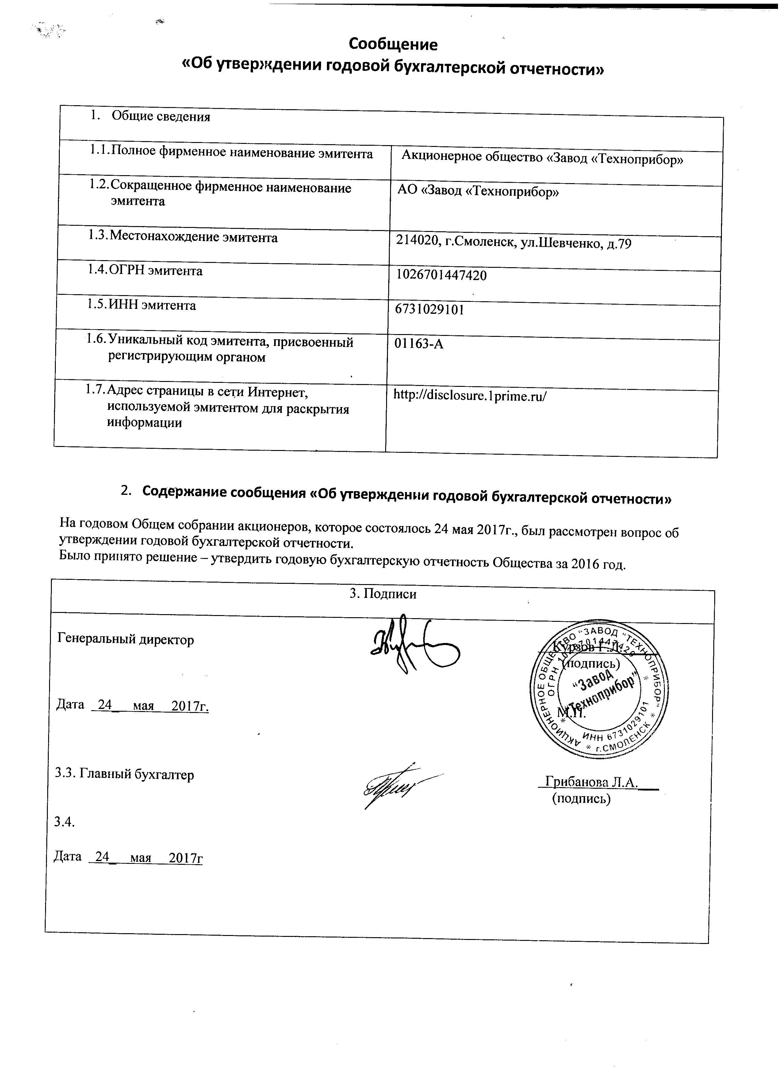 | 9 | Сообщение об утверждении или неутверждении годовой бухгалтерской отчетности (5) | 24.05.2017 | 25.05.2017 | Загрузить (650,50 Кб) |  |