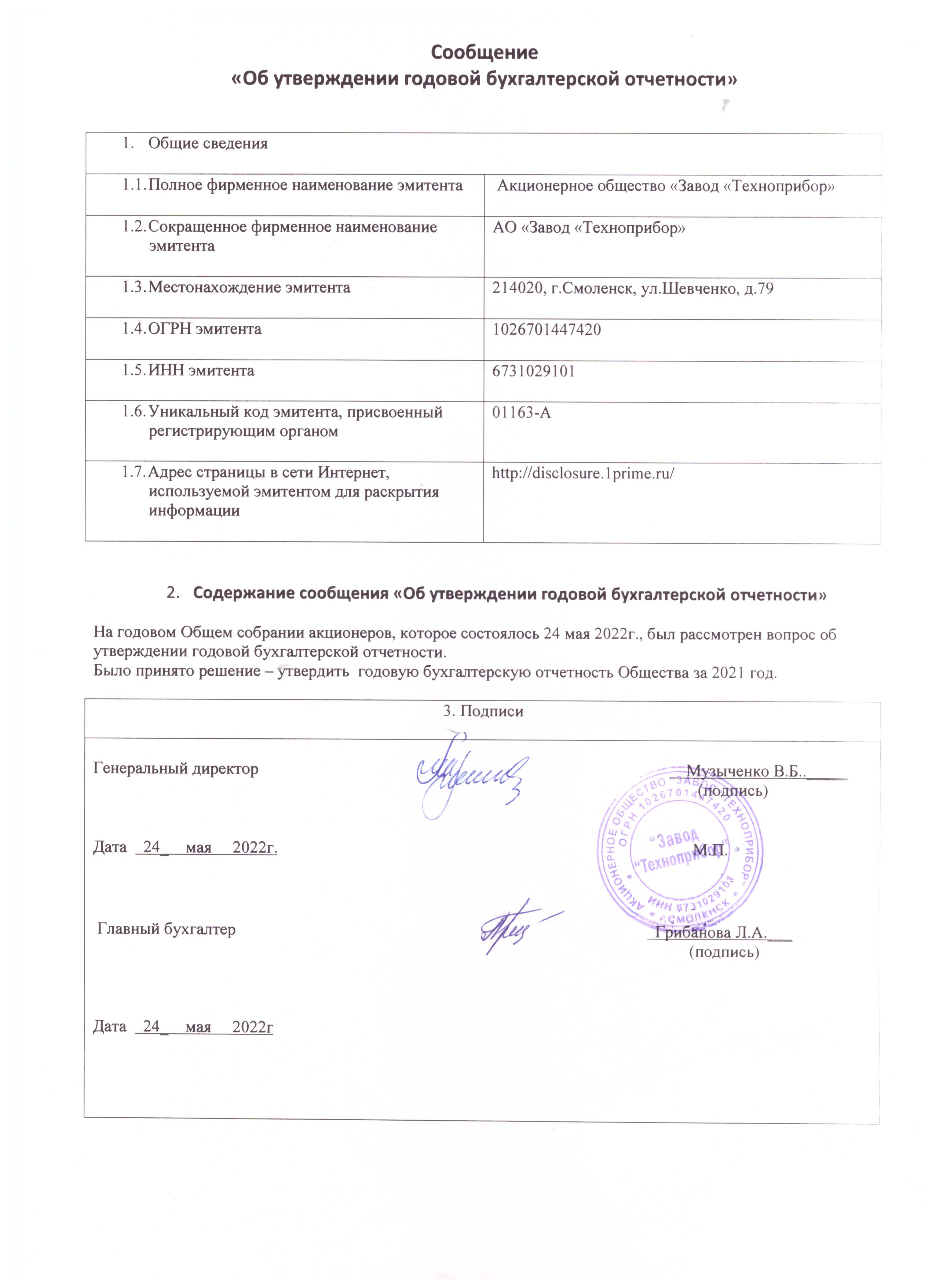 | 4 | Сообщение об утверждении или неутверждении годовой бухгалтерской отчетности (10) | 24.05.2022 | 24.05.2022 | Загрузить (428,51 Кб) |  |