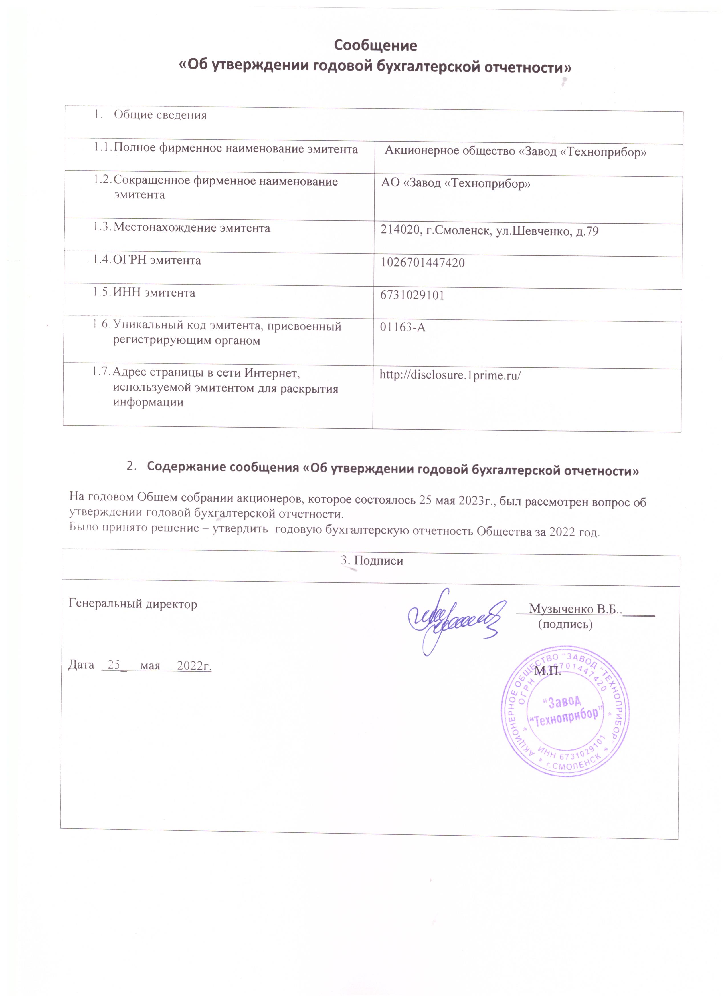 | 3 | Сообщение об утверждении или неутверждении годовой бухгалтерской отчетности (11) | 25.05.2023 | 25.05.2023 | Загрузить (402,94 Кб) |  |