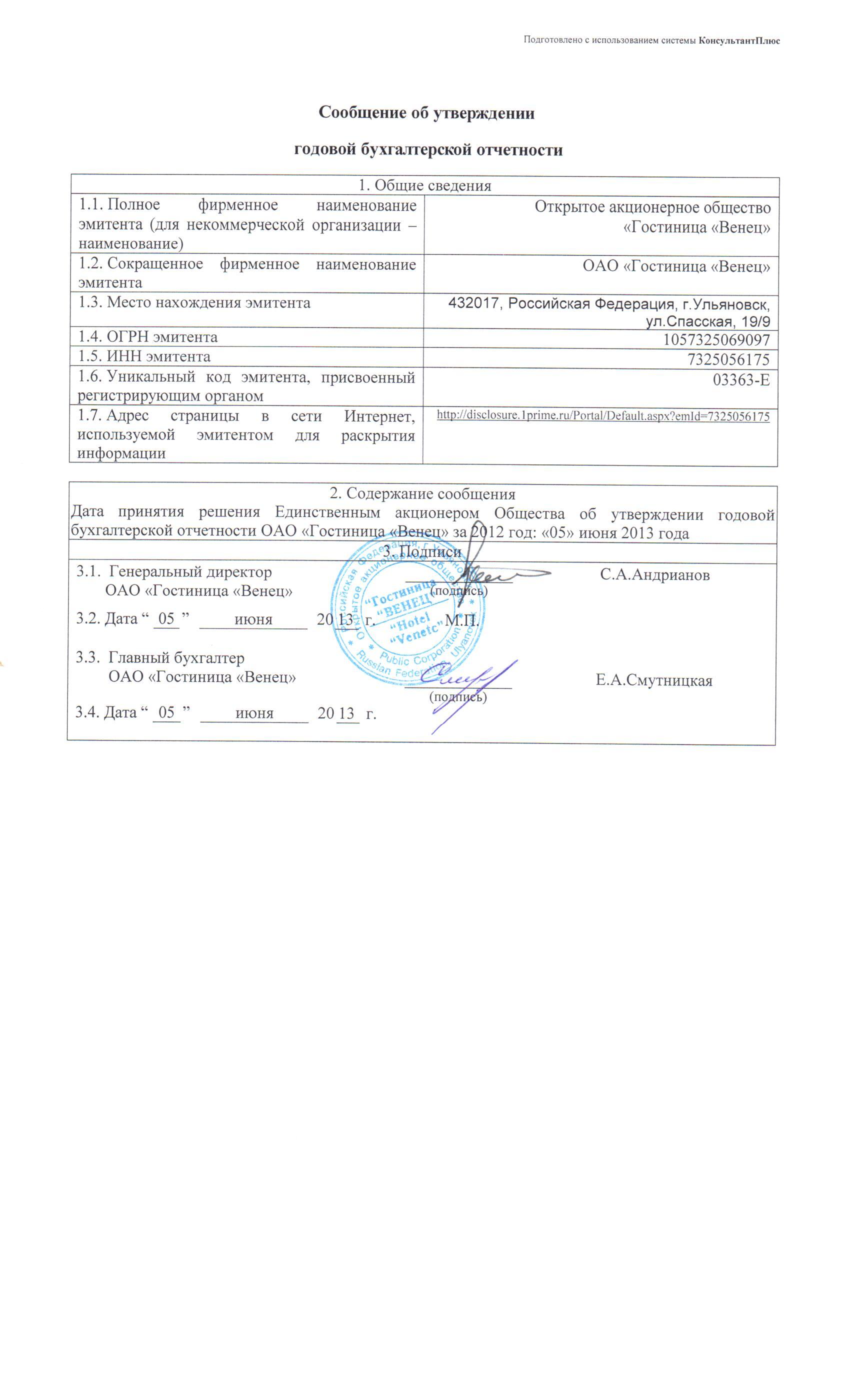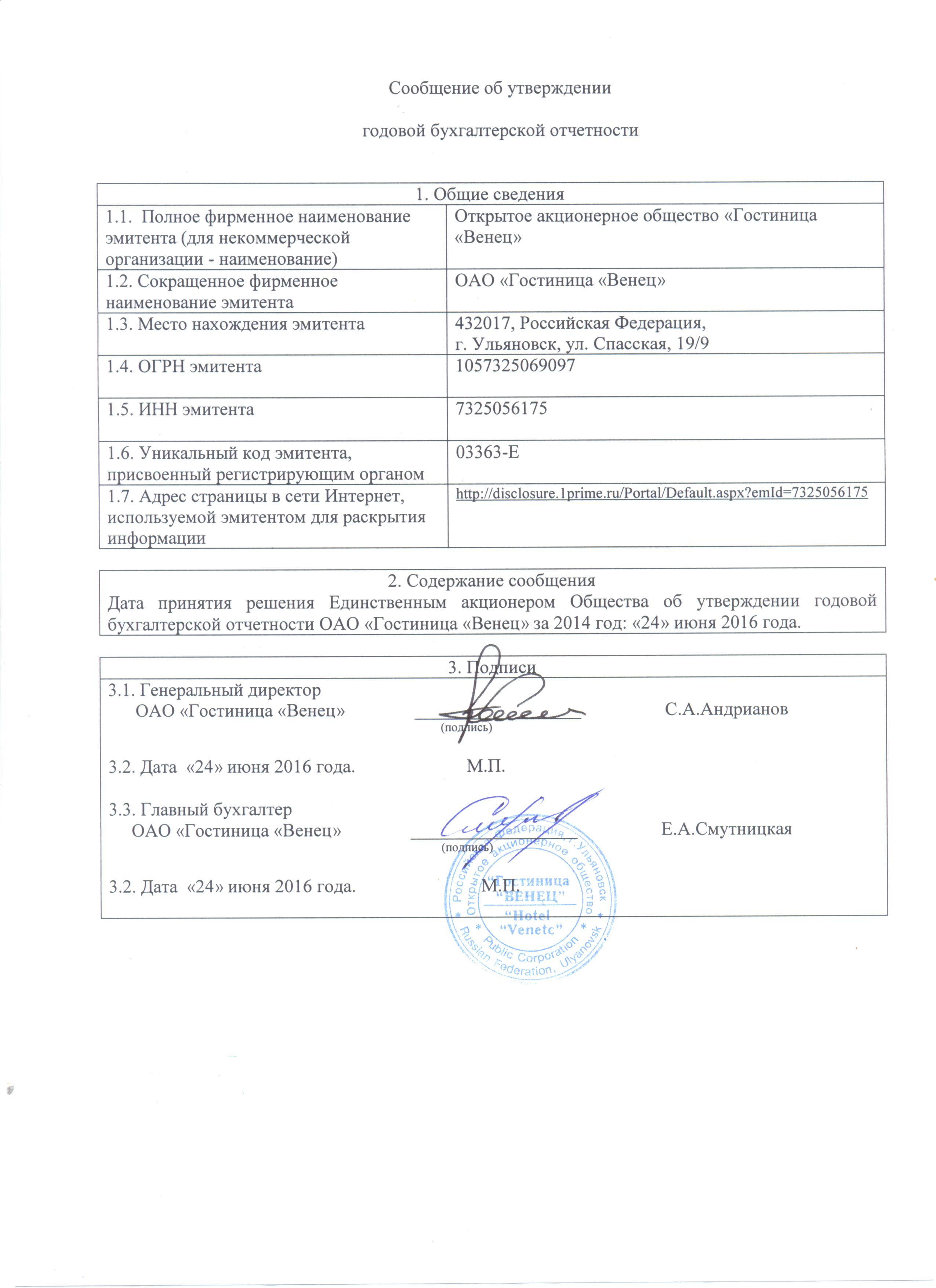 1 | Сообщение об утверждении или неутверждении годовой бухгалтерской отчетности (3) | 22.06.2016 | 24.06.2016 | Загрузить (460,97 Кб) | |