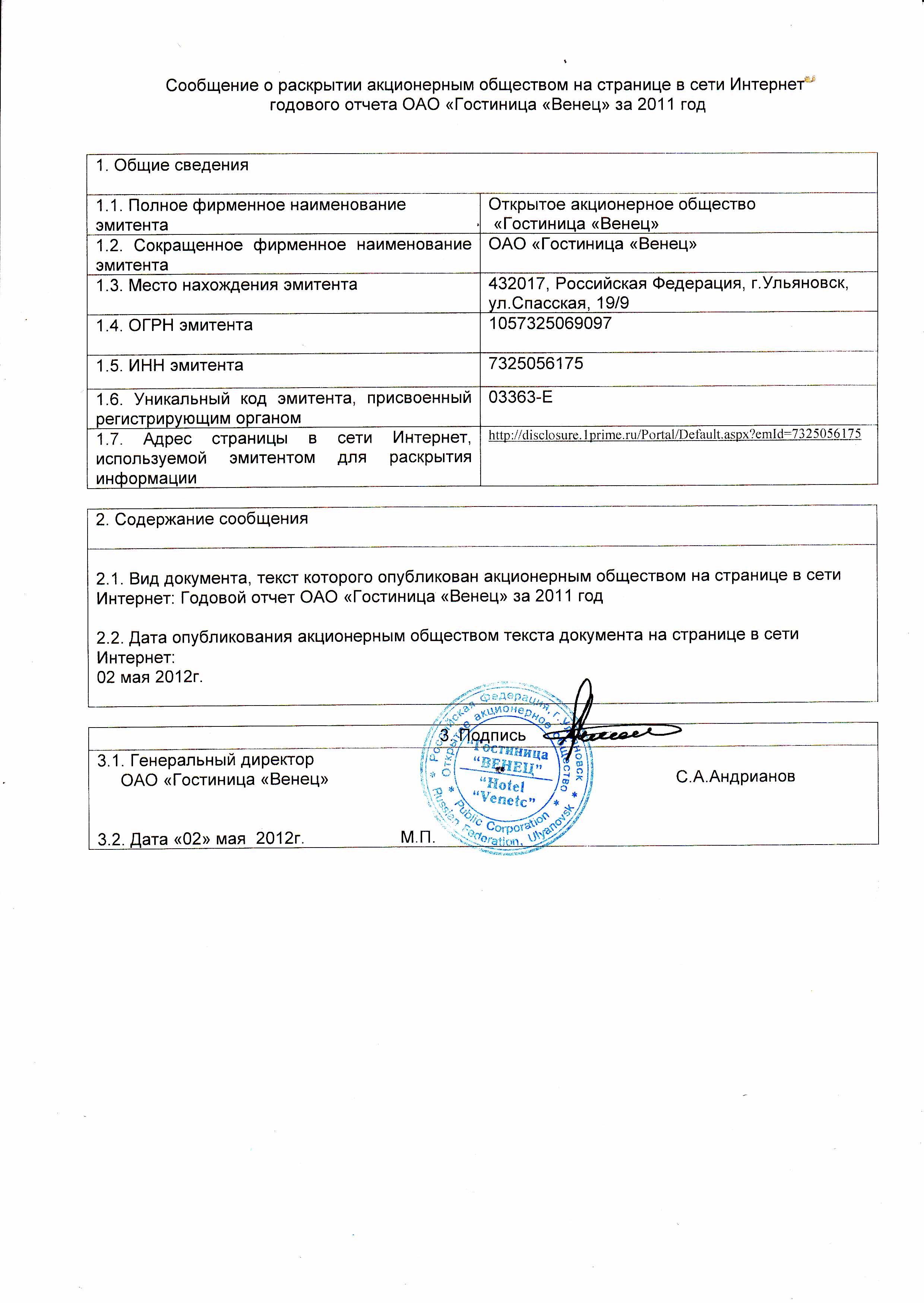 Сообщение о раскрытии АО на странице в сети Интернет годового отчета за 2011 год от 02.05.2012 | |