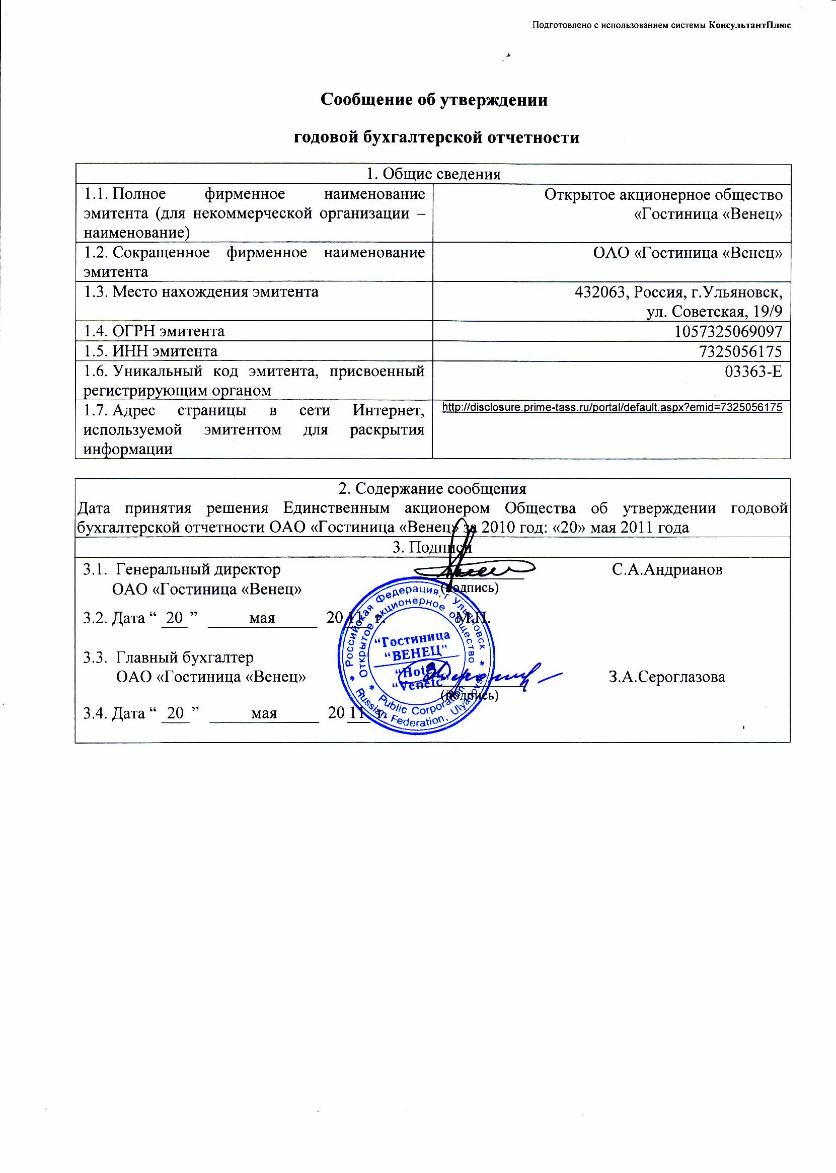 Сообщение об утверждении годовой бухгалтерской отчетности от 20.05.2011 | |