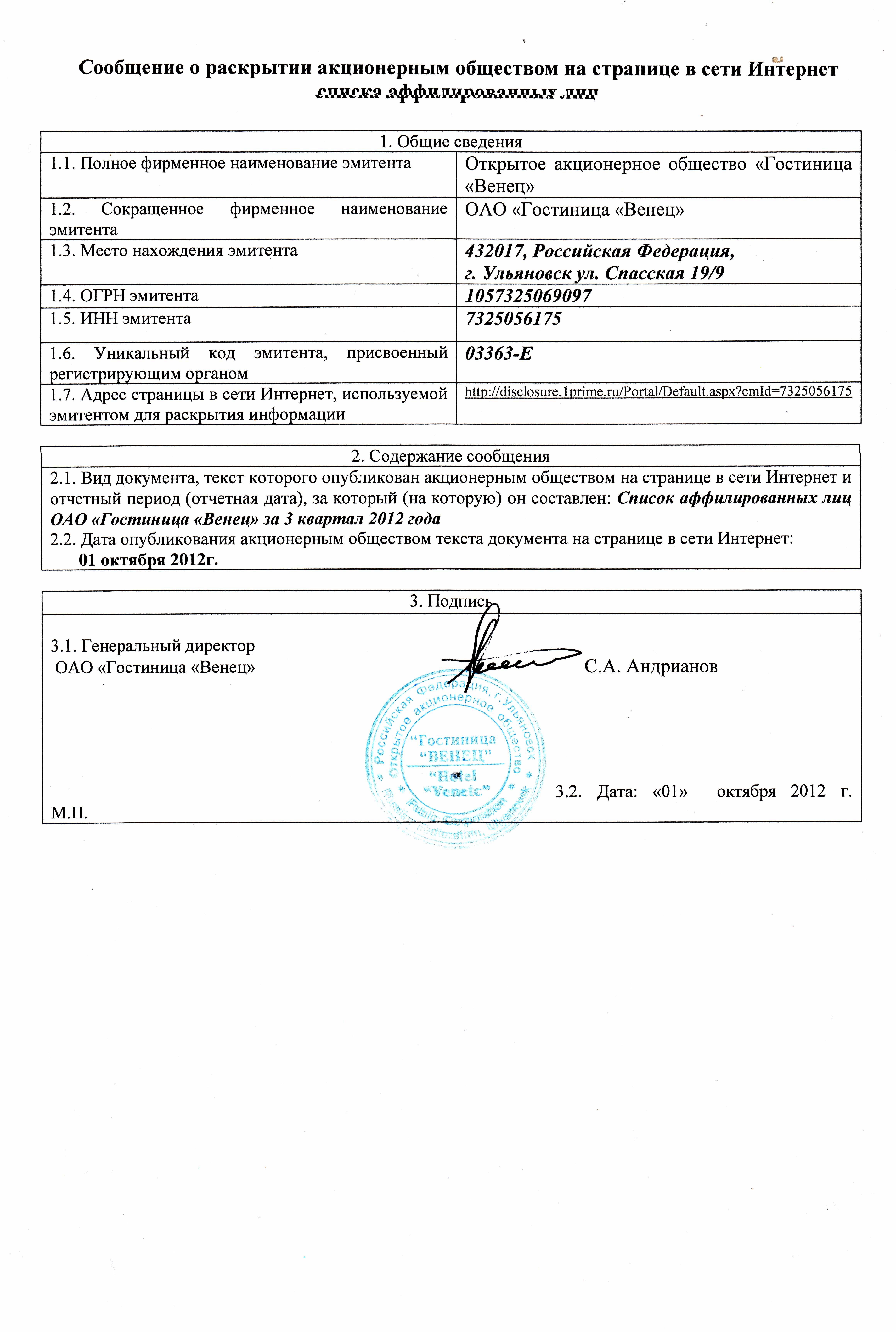 Сообщение о раскрытии АО на странице в сети Интернет списка аффилированных лиц за 3 квартал 2012г. от 01.10.2012 (1,48 Мб) | |