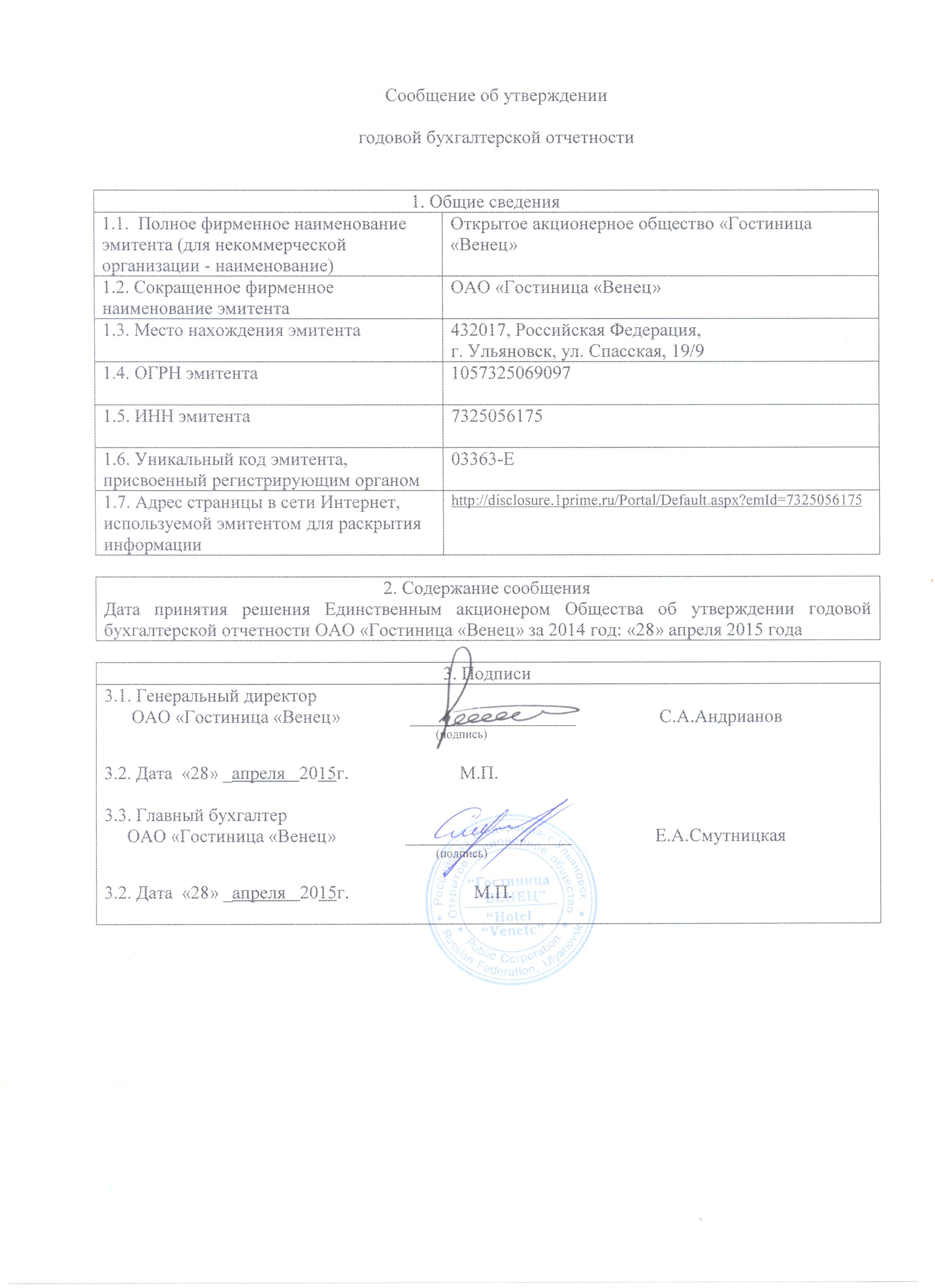 2 | Сообщение об утверждении или неутверждении годовой бухгалтерской отчетности (2) | 28.04.2015 | 30.04.2015 | Загрузить (458,99 Кб) | |