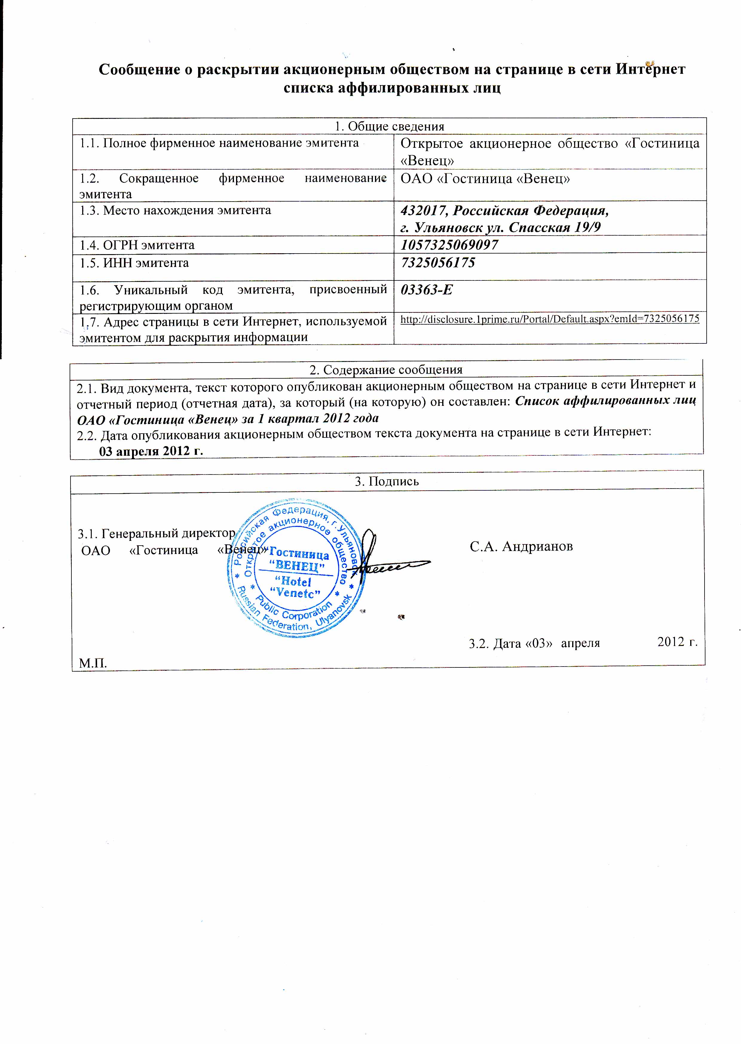 Сообщение о раскрытии АО на странице в сети Интернет списка аффилированных лиц за 1 квартал 2012г. от 03.04.2012 | |