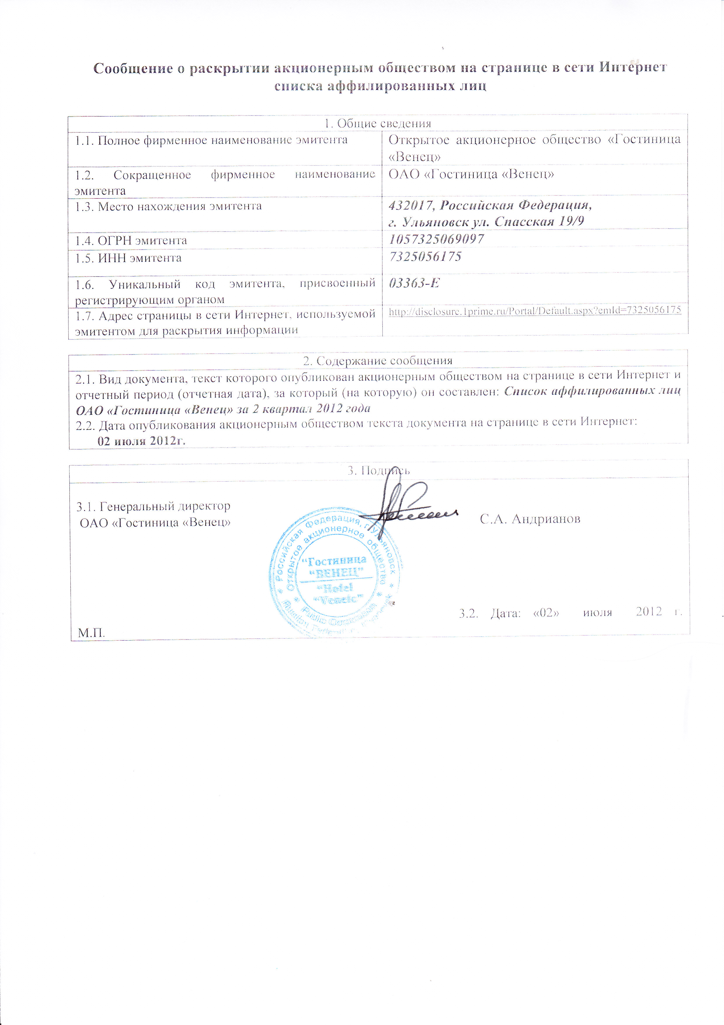 Сообщение о раскрытии АО на странице в сети Интернет списка аффилированных лиц за 2 квартал 2012г. от 02.07.2012 (1,03 Мб) | |