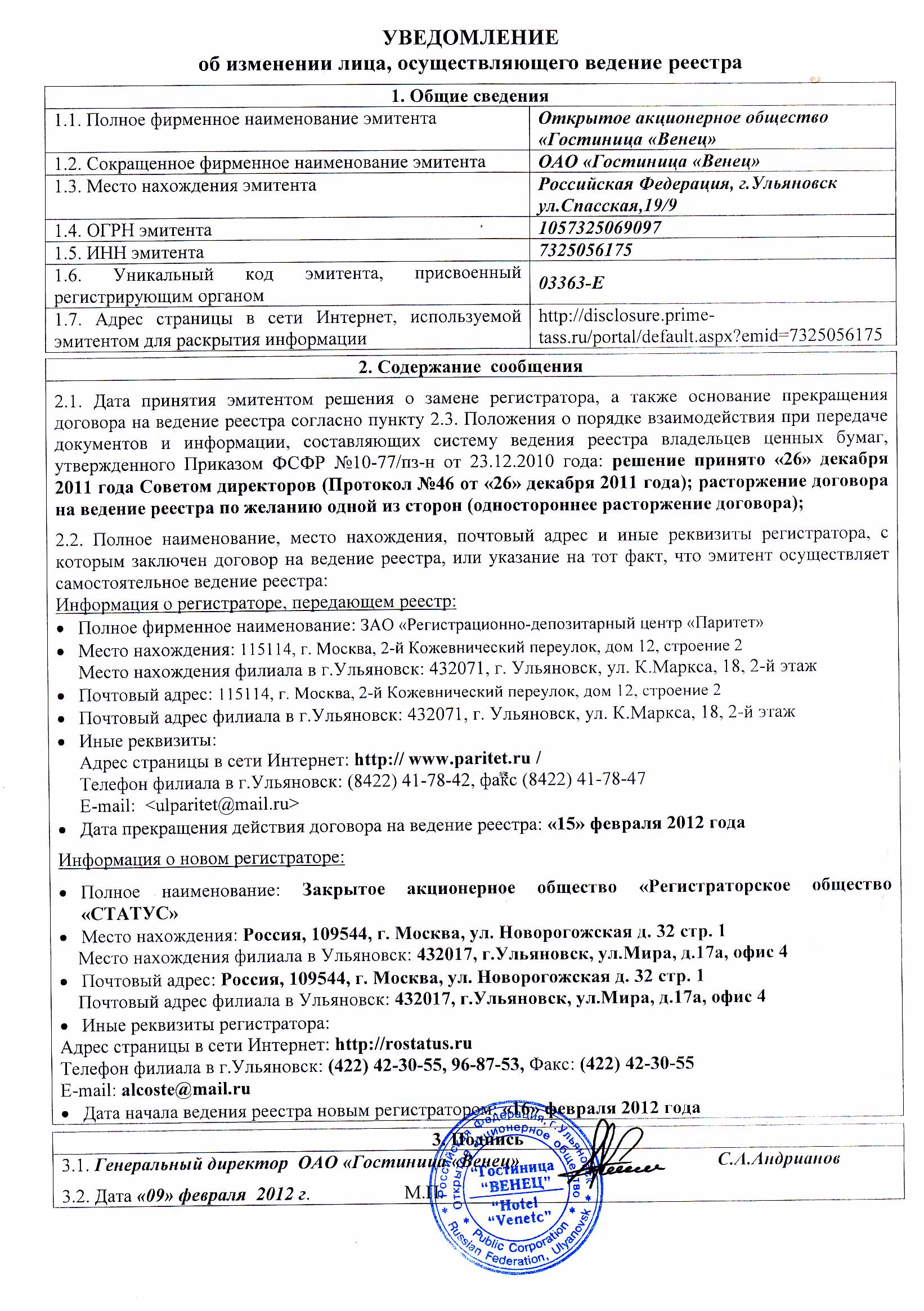 Уведомление об изменении лица, осуществляющего ведение реестра от 09.02.2012 | |