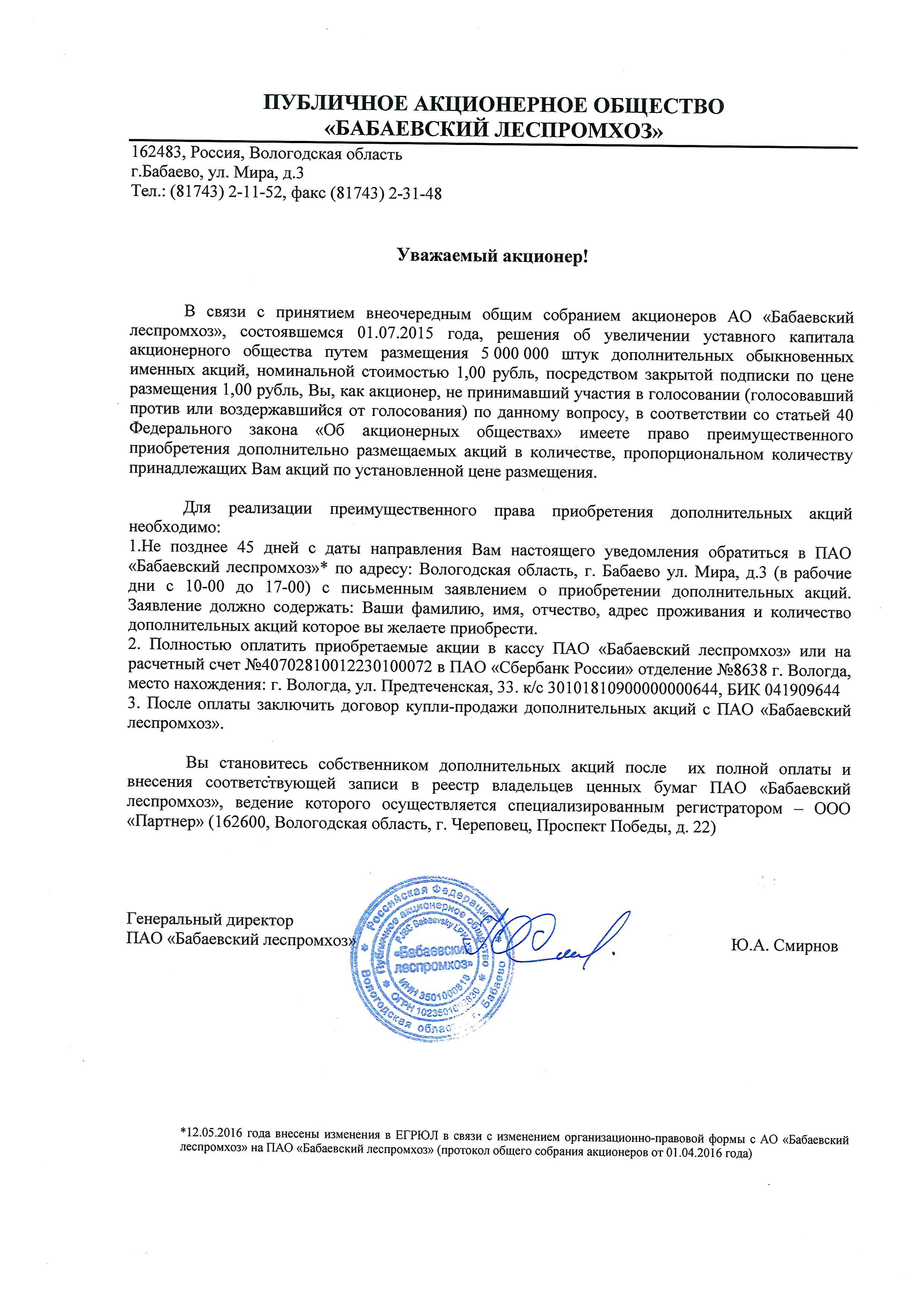 1 | Уведомление о возможности осуществления акционерами преимущественного права приобретения размещаемых ценных бумаг (предусмотрено Уставом Общества) от 24.06.2016 | 29.07.2016 | Загрузить (508,44 Кб) | |