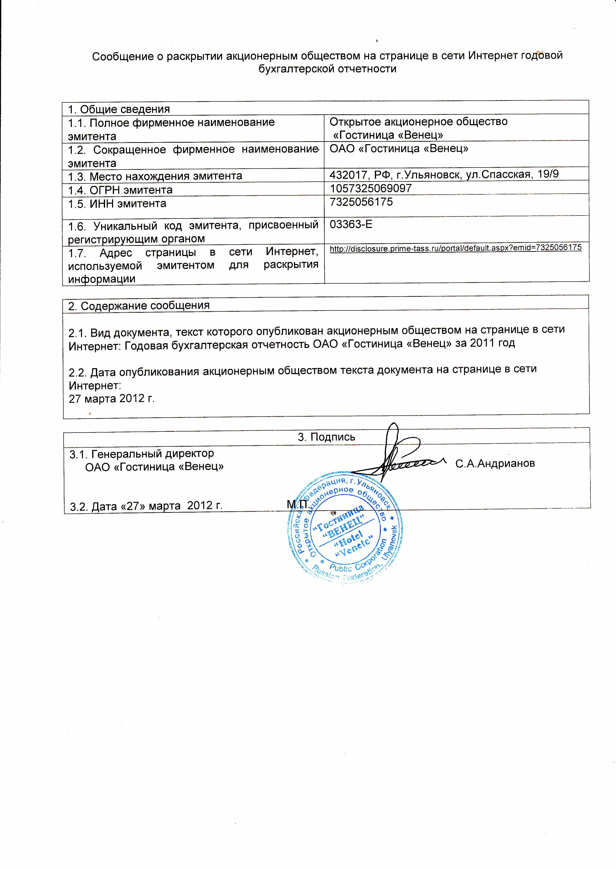 Сообщение о раскрытии на странице в сети Интернет годовой бухгалтерской отчетности за 2011г. от 27.03.2012 | |